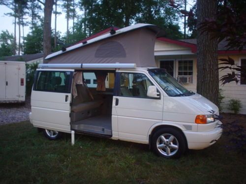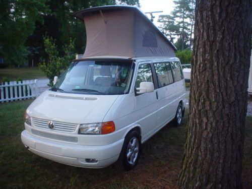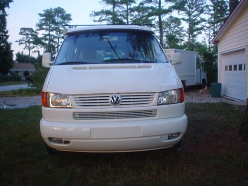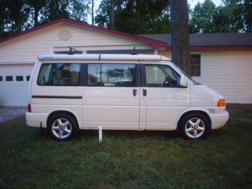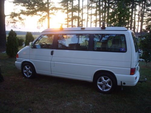 This is a 1 OWNER very well maintained daily driver. Have taken many trips up and down the East Coast from Quebec to Key West and never have been stranded because of my maintenace habits Just install Michelin HYDROEDGE* correct load rated tires, transmission service, ball joints, cv joints and boots, ignition coils, tune up, filters and oil change. Yes I have receipts. I installed VW factory, front and rear tire mud flaps and full carpet mats 2" trailer hitch receiver with both a flat 4 and round 6 pin electric hook up with an electric brake system under dash by steering wheel SIDEWINDER* 6' x 8' awaning YAKAMA roof system with 2 bars and 3 mounting positions (6 roof brackets) I installed a 120 volt 20 amp GFIC outlet by rear bench seat and dinette table. The power is supplied by a heavy duty RV style extension cord and a 'male' hookup I have mounted on the driver side rear bumper. This is a Marine/RV item with rubber plug/cap. IGLOO* 3cubic foot 12volt/120volt cooler/warmer There is a factory equiped/installed 12 volt beverage cooler under rear facing seat on drivers side with a fold up table between this seat and rear bench, cup holders through out will include camping gear to get and keep you with the outdoors: 2 burner propane stove, gas grill and more there is a factory privacy curtain for front window shield and doors, curtains thru out, 12 volt lighting, screen for rear hatch door and screens installed on side rear sliding windows