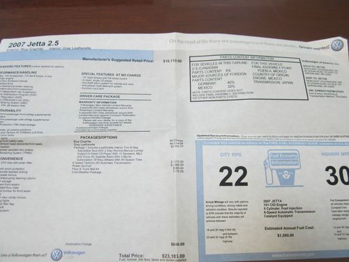 Highly optioned 2007 VW Jetta. Single owner non-smoker with no accidents. 30mpg highway fuel economy in a very safe and reliable car. Purchased and serviced locally at Seacoast Volkswagen in Greenland, NH. Very good interior and exterior given its age. Clean and detailed. No known mechanical issues or problems. Purchased new in late 2007 for $23,185 and has run perfectly since new.