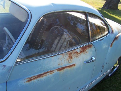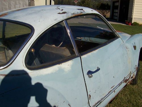 This is a 1960 Karman Ghia. It has NO MOTOR. The car has lots of good parts but you be the judge. I tried to take lots of pics so look the over and ask anything you may want to know. As I hope you can see the floor is gone on driver front (rust) and mostly gone in drivers back and hole on passenger front and back. The doors look pretty good to me as does the hood and trunk? the chrome around all the windows is in good shape with only light pitting. Please just look at pics and judge for youself what its value is. thanks for looking