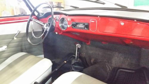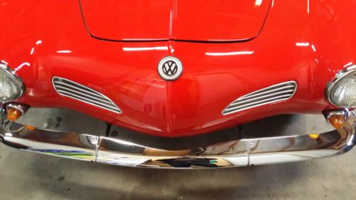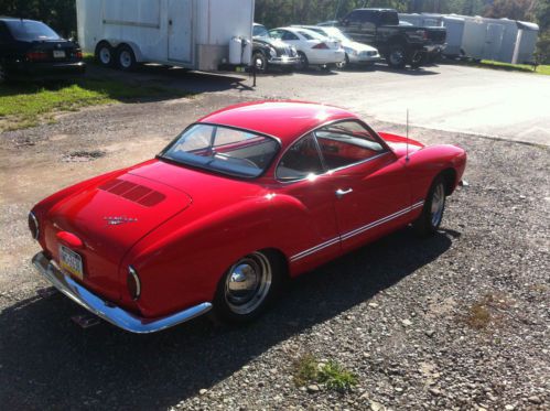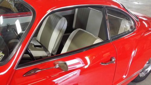This auction is for a fully restored 1963 Karmann Ghia coupe. The car has been gone over from top to bottom starting with the exterior work on the vehicle. All body work was repaired, and the vehicle was painted Corvette Torch Red. The bumpers are brand new, all exterior emblems are new. All gaskets have been replaced including engine and trunk gaskets, window gaskets, windshield molding, rear window molding. The floor boards are in excellent shape and are not rotted. The chassis has new drum brakes all around, new shocks. There is some slight play in steering box. The interior was completely upholstered. Only flaw is mark on rear seat cushion. The engine has been completely rebuilt with new crank, pistons, rods, heads were redone, new gaskets, upgraded to 12v ignition system, upgraded dual carburetors. The transmission has a short throw shifter. The car is in excellent shape. You really have to see it to appreciate the work that was done. The body work and paint work is excellent. I have receipts for all engine work done as well as receipts for most of the exterior trim, bumpers, etc. Please feel free to e-mail me with any questions you may have. |
