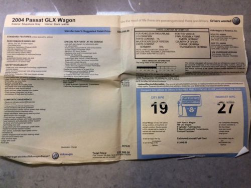 2.8L V6 engine FWD 5-speed Automatic Tiptronic transmission Exterior: Silverstone Gray Interior: Black Leather One owner Mostly freeway miles (SF <---> Silicon Valley); low miles since 2008 Well maintained by local SF Volkswagen specialists Recent service and oil change; Michelin tires installed last year (<3K miles) Registration paid in January Yakima roof bike racks All season floor mats Rear cargo cover Anti-theft alarm system for vehicle and radio 16" alloy wheels Power glass sunroof with tilt, slide and preselect In-dash single CD/cassette player Monsoon Sound System Heatable driver and front passenger seats OnStar Telematics Includes my wife's Justin Timberlake CD |