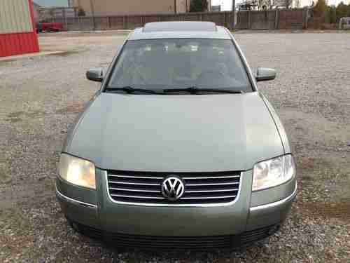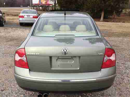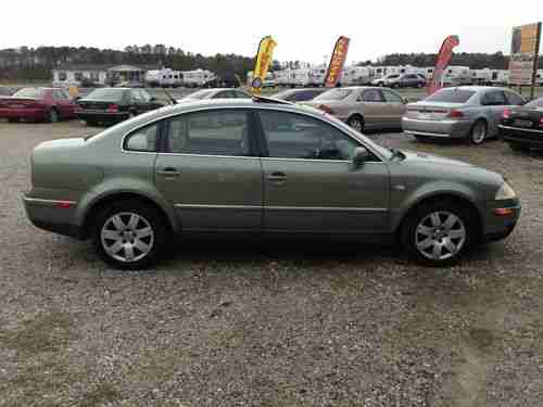 UP FOR SALE IN A 3 DAY ONLY NO RESERVE AUCTION HIGHEST BIDDER WINS IS A WELL MAINTAINED CLEAN 2003 V W PASSAT DRESSED IN A OLIVE GREEN THAT STILL HOLDS A SHOWROOM SHINE AND ABOVE AVERAGE WEAR WITH FEW BLEMISHES AND NO MAJOR DAMAGE,TRIMMED IN TAN LEATHER SEATS THAT ARE HEATED AND HAS ABOVE AVERAGE WEAR NO RIP OR TEARS OR STAINS TRIMMED IN LIGHT BURL WOOD DASH AND DOORS CENTER CONSOLE ALL FUNCTIONS OPERATE.TIRES ARE IN GOOD SHAPE SOME SCRAPES ON THE WHEELS THERE IS A BRAKE PAD LIGHT ON BUT BRAKES ARE GOOD.IT IS POWERED BY A 6 CYLINDER 2.8 LITER ENGINE THAT IS RUNNING SOLID PARTNERED BY 5 SPEED AUTOMATIC TRANSMISSION RESPOND SMOOTHLY. THERE IS A WHOLE LOT OF V W LEFT HERE BUY THIS ONE WITH CONFIDENCE AND HIGHEST BIDDER OWNS IT. THERE IS A $200.00 ADMINISTRATION FEE IN ADDITION TO THE FINAL BID WHICH WILL ALSO INCLUDE DETAIL PREP WORK AND 60 DAY TEMP TAG IF NEEDED.WE HAVE DESCRIBE THIS V W PASSAT TO THE BEST OF OUR KNOWLEDGE AND ALL SALES ARE FINAL AND AS IS UNLESS YOU CHOOSE TO PURCHASE A EXTENDED WARRANTY THAT IS AVAILABLE FOR ADDITIONAL COST. FEEL FREE TO STOP BY AND TEST DRIVE OR SEE OR CONTACT US WITH QUESTIONS OR CONCERNS. GOOD LUCK AND GOD BLESS!