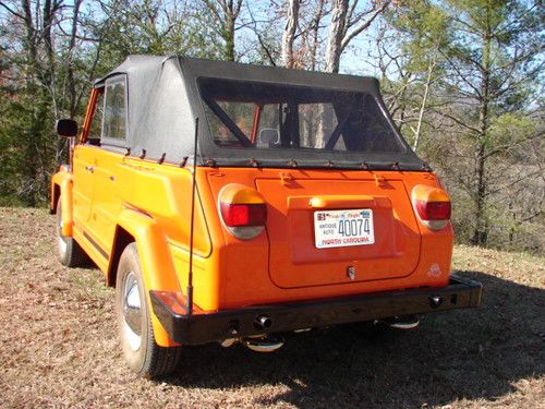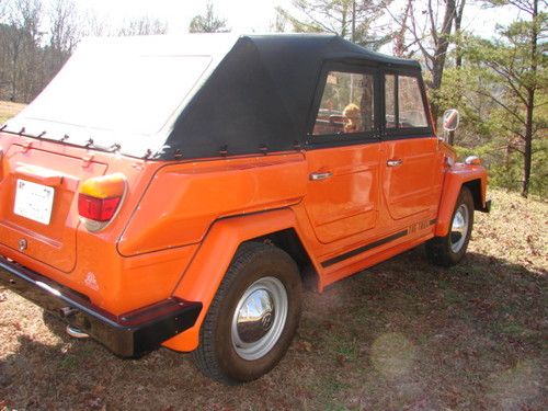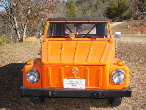 RESTORED 74 VW Thing-Exterior and Interior are excellent. Runs great, transmission and clutch strong, motor looks great! New muffler, thing shop stainless steel headers, brake drums and shoes, new axles & cv joints. Bodywork and paint by previous owner done professionally. Original motor with work performed by previous owner. Odometer not working properly, thus I don't know how many miles are on the car. However, taking into consideration how the motor looks and how well taken care of the car was before I bought it 3 years ago, I didn't much care that I couldn't verify mileage. Tires are like new, wood slatted floor looks great. Convertible top and removable windows like new. All around a great looking, fun car to drive.....gets lots of attention, too. Call Ken at 828-524-8090 or cell 828-421-2234 with any questions. Located in western NC.