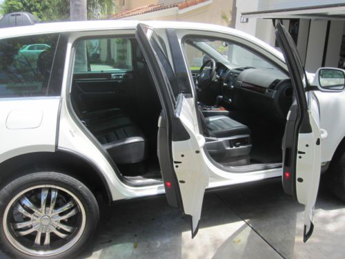 For sale is a 2004 Volkswagen Touareg sport v6 model in White with Black Leather Interior. This car has low mileage at 73,000 miles and comes with chrome wheels and larger tires to fit them. The car drives smoothly and has a very strong engine. The stereo sounds very good and has the basic audio setup. The car also includes a sunroof and power windows as well as sun shades in the back windows so passengers can sit in the sun comfortably. The car has a large trunk and also has 2 power outlets for emergency in the back. The car has been well kept but needs some tlc. As with all other Touaregs from 2004 the rubber paint on the interior has small chips and dings on the buttons but aren't everywhere. The car has heated seats which are very nice addition and are helpful with cold winters. If you have any questions or concerns please contact me at (949) 756-2060.