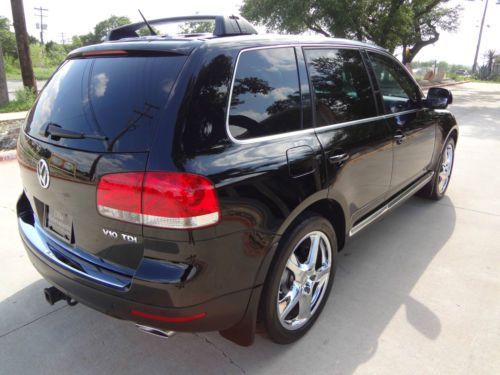 You are bidding on a 2006 Volkswagen Touareg v10 Diesel. 112,913 miles. Two owners, non-smokers. Clean title and Car Fax. No paint work, Great SUV, rare find. 17MPG city; 23MPG HWY Exterior: Black Interior: Tan Leather Included Options: Power Seats w/ Memory Heated Front and Rear Seats Rear A/C Sys Sunroof Navigation Rear View Camera CD iPod Hookup Bluetooth 20" Chrome Wheels Trailering Pkg All Books 2 Keys EXTREMELY RARE For more information please contact Elite Motorsports at 512-452-9068