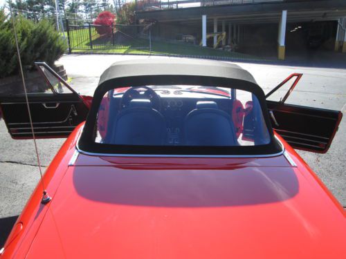 ONE OWNER with 55,840 ACTUAL MILES, Sold New locally where it has remained for 39 years. Complete SET of BOOKS original to the vehicle. Service Records Included. Tire Changing Tools and Hand Tool Kit Included. Vehicle starts, runs and drives as a 55K mile car should. NO transmission shifting or clutch problems. Engine Compartment and finishes are totally original and have not been "cleaned for sale". Trunk and finishes are all original to include mat. Interior is totally original except the front seat cushions that were replaced with the proper material / pattern due to stitching separation. Door panels, Dash pad, Carpeting, Rear seat area, Rubber floor covering are original and free of cracking or evidence of wear. Original AM-FM Radio. Everything operates as it should. Original Cloth top was replaced with Factory Style Cloth Top due to light rear window fogging. 5 Factory Alloy wheels with NEW Premium Tires on the ground and original Michelin on the spare. Bright metal, Glass and Body Seals are all in good to Excellent Condition. I recently had the vehicle refinished ($4650 refinish only with no metal work) in the proper original color. At sometime in the past, the car was repainted in the wrong shade of red that did not match the virgin jams, engine compartment and trunk. Questions? Call the owner at 908 872 7356 |