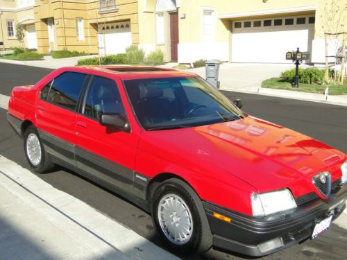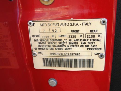 IN GOOD CONDITION. MFD BY FIAT AUTO S.P.A- ITALY FULLY LOADED MILEAGE 163xxx RED WITH BLACK INTERIOR. AUTOMATIC TRANSMISSION ...SHIFT SMOOTH..GOOD BRAKING SYSTEM SERIAL NUMBER ZAREA43L5P62667681 MANUFACTURING DATE 07 / 92 THE FIRST OWNER BOUGHT THE CAR AT CAMMISA MOTORS -SELLING EXOTIC ,LUXURY ,PERFORMANCE AND COLLECTIBLE FOR OVER 25 YEARS (ALFA ROMEO DEALER IN BURLINGAME CA)I AM THE SECOND OWNER AND I HAVE BEEN DRIVING THE CAR FOR MONTHS WITH NO PROBLEMS IT HASN'T BEEN ABUSED . TRUNK AND SPARE TIRE GOOD PLUS CONDITION AND ORIGINAL THERE IS NOT RUST (CALIFORNIA CAR) solid INTERIOR IS ORIGINAL BLACK ..ALL WINDOWS, SUNROOF ,RADIO ,AIR ,POWER SEATS .POWER LOCKS AND POWER ALARM OPEN AND CLOSE ,99% ALL WORK GOOD .... DASHBOARD IS ORIGINAL AND GOOD CONDITION. I HAVE NOT SEEN ANY CRACKS . DOOR PANELS ARE ORIGINAL AND IN GOOD CONDITION. HEADLINER IS ORIGINAL AND IN GOOD CONDITION. THE TIRES ARE MATCHING ALL WEATHER PIRELLI 95% NEW ,NEW AIRFLOW METER,AIR FILTER,HOOD SHOCKS,THERMOSTAT , OIL CHANGE.ETC CAR NEEDS SOME INTERIOR ( SEAT) WORK....IDDLE SOMETIMES IS UNSTABLE WHEN GASOLINE IS LOW......please see pictures ...what you see is what you get... if you have any more questions about the car,