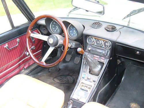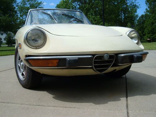 1974 Alfa Romeo spider. 2 litre DOHC, 5 speed, 4 wheel disc, etc. etc. To be done: needs paint, plenty of solid bondo in rockers but no telling if it needs to be removed, spare tire well needs rust repair, or not. Interior needs much attention especially door panels and radio wiring. Needs windshield, brake work (rear line got cut by grinder replacing floors) though it still stops fine with the fronts only, much cleaning and detailing. Done; floors repaired (passenger) and replaced (drivers), now good and solid after burning much welding wire. Runs very strong (Dall'Ortos)! Gas line cleaned out from tank to carbs. All exterior lights work to my surprise. Very new tires on later Alfa 5 Star aluminum wheels in very, very nice condition (no curb rash). Bumpers are decent as are seat covers and vinyl top. This is the last year of the steel bumper spiders and while much needs to be done, the big work (floors) has been taken care of. Oh and it only has 55,000 original miles. Very little paperwork from the crook in Connecticut I bought this car from. Have a bill of sale and some other registration docs, I'm sure he will be co-operative with a new owner to redeem his reputation ( I have his contact info). Your state may not be as picky as New York in registering it also. Over all not a bad car, just needs some love.