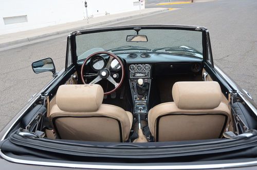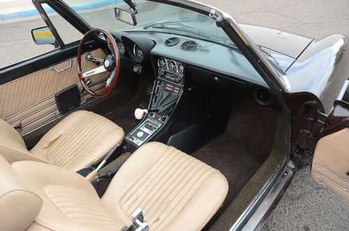 Nice condition throughout, this Alfa is wonderful to drive, with a tight feeling chassis, great gearbox, and strong engine. It is simply a joy to cruise around in this car! The Chocolate Brown exterior combined with beige and black interior is a classy and beautiful throwback to the 70s. If you've never driven an Alfa Romeo Spider, you won't believe what an elegant and rewarding motoring experience it is. These cars are seriously undervalued in today's classic car market but they will steadily grow in value in coming years, making them a great buy right now. Exterior: The body is very straight with only a few small dings and dents. There is zero rust on the car, having spent its pampered life in California and New Mexico. The Chocolate Brown paint is an older re-spray of seemingly good quality, but is now fairly tired with staining, scratches and discoloration on the hood and upper fenders. The trunk has checking. The paint on the sides is still very good, helping the car to look great out on the road. The brightwork is very good, with only minor scratches in some areas. There is no corrosion and no missing pieces. Both bumpers are in good condition and sit evenly on the car. The wheels are period-correct Western Turbinas that have been refinished. They are in excellent condition. The tires are brand new with full tread depth. There are wheel locks on each wheel along with the proper lock adapter. The car has a brand new black vinyl top that functions very well. Though the cable tensioners are not installed (new ones come with the car), it lifts and stows smoothly and seals up nice and snug. A top boot will come with the car, though it has a few seam splits and some broken clips. Interior: The interior is in good condition. The black dash is nicely preserved but with a couple of cracks by the vents. These are mostly only visible looking in from the windshield. The door panels are nice, though the plastic chrome trim is pealing and there is minor warping on the passengers side. The door handles and window winders are in good condition and work properly. The original brown carpet is still in very good condition except for a hole from the driver's heel by the gas pedal. The seats have some staining on the headrests and a few tears. The seat foam is still in very solid and the seats function properly and are very comfortable. The factory Personal steering wheel is in great shape, and with its smoothly polished wood rim and nice aluminum spokes, it's a great interface to the driving experience. The shift knob has the typical Alfa patina, worn but smooth to the hand. The shift boot is new. Gauges and trim are in very good condition. The steering column controls are a little loose and there is a missing switch in the center console. Mechanical: The twin cam two liter Alfa Romeo engine in this car runs great, with the smooth revving character and flexible power band that makes them legendary. It is very healthy with even and consistent compression numbers (150, 156, 155, 155) across the cylinders. We inspected the cam lobes and lifters when we had the valve cover off and they are very good with no obvious wear. The engine has new NGK spark plugs, valve cover gasket, new alternator belt, fresh coolant, and new oil and filter. The Spica fuel injection is in good condition, though it could probably benefit from some professional adjustment. It starts the engine quickly and reliably, hot or cold, but idles high until warmed up. Once at operating temperature, it idles normally. Please note: this engine was de-smogged at some point; it has no smog pump or related emissions plumbing. The exhaust system is a non-factory custom job that sounds great! The five speed gearbox is wonderful on this car, with smooth, strong gear selection and no slop in the shift action. It is a pleasure to row through the gears. The clutch operates well and feels good. Suspension and Brakes: The suspension on this Alfa is in good working condition. The shocks are older Spica (!) units that feel a little tired, but the car is tight and responsive going down the road. There are no shakes, shimmies, or excessive play. The brakes work well, except that they do pull a little to the left under hard braking. Overall: This Alfa Romeo Spider is an absolute pleasure to experience, whether driving and or just looking at. It has a wonderfully vintage look with the color combo, and though it is not show quality (new paint alone would put it very close), it would be a hit at any local car show or Cars and Coffee. Everywhere the car goes, it attracts admirers. It is a car that is ready to enjoy as is, and is also an exceptional base to restore to a high level. Call |