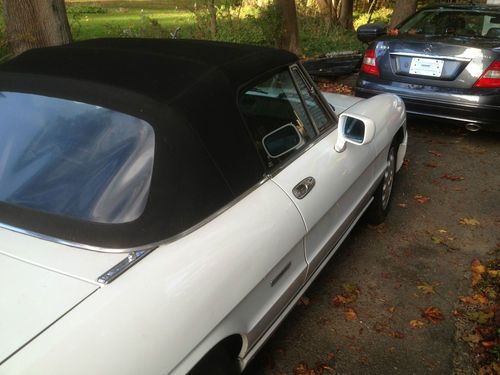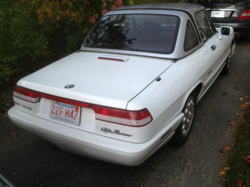 The last buyer did not come through. Please dont bid if you are not serious about purchasing the car. Thanks Up for auction is a 1992 Alfa Romeo Spider. The car runs and drives well. The Mass inspection sticker is current through next July, and there are four new tires on the car with less than 3000 miles on them. The car comes with a soft top and a hard to find hard top. The hardtop needs to be painted, but functions correctly (dome light and heater), and all of the glass is fine. The soft top, carpet, seats and check straps are worn in some areas, and the car could use a paint job - thus the low price. The car has the original paint, but it still gets lots of looks and attention where ever I go with it. The car has always been garaged, and has never been driven in the winter. There are some minor dings in the front (thats how I bought it years ago), but they are not really noticaeable - see pics. The A/C compressor needs to be replaced if you want A/C - I never cared about that. The badges, decals, and wheel emblems are all new. The car comes with a rough shape owners manual (some pages are stuck together) and a spare tire and jack supplies. The car also comes with an Alfa Romeo full service manual. The car in the spring had the long and short air plenums changed. The interior center console lights have been changed to LEDs - I have LED lamps for other areas as well like the trunk, hood etc. The brake bleeders have been upgraded to the 1/4 turn one man bleeding type. I did plan to work on the cylinder head at some point, so I have a complete engine gasket set, valve guides and guide seals. I also have some other parts like the four intake plenums for the cylinder, new belt and so on. There are two small spots of surface rust - one by the hood, and one by the lisence plate - see pics. The floor panels, rockers, doors and hoods are all solid. The engine bay is very clean and the car starts right up. The transmission does not slip at all. The car has never been in an accident. I do not have the rear body clips for the hardtop mounting.The muffler is only a few years old, but some part came loose inside it recently so sometimes you can hear that part vibrating around when idling. This is a good car for the price I am asking. Serious bidders only please, and bidders only with non zero feedback Please feel free to contact me for a viewing, test drive or question.