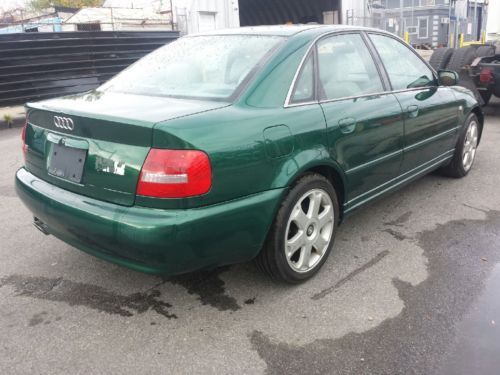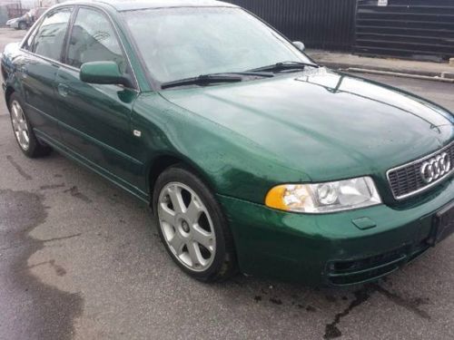 Hello EBAY. Up for sale is a 2001 Audi S4. The car is green in color with white leather interior, automatic transmission, twin turbo, sunroof, leather seats, cd player, power windows an seats. This car runs and drives, it does have some body damage to the left side quarter panel, does have some minor scratches all around the car. No known mechanical issues. This is a good running car, all wheel drive, it was totaled out by the insurance company for body damage. This car has no major frame damage just cosmetics. Selling this car with no reserve, the highest bidder will win this item. This car has a NY SALVAGE 907A TITLE