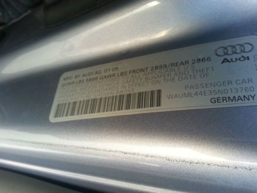 2005 AUDI A8 L LIGHTLY FLOODED FULLY LOADED NAVIGATION XM LEATHER SUNROOF POWER EVERYTHING NO RESERVE SALVAGE TITLE · Automatic transmission Purchased from an insurance company due to "LIGHTLY FLOODED everything works as they should i can be driven any where in US I ASSUME WATER LEVEL ONLY WENT UP TO HALF OF THE WHEELS THERE IS NO SIGNS OF WATER AT ALL After purchasing the car, we did a full inspection. The car RUNS & DRIVES GREAT. It has only 74k miles, and the engine/transmission work 100% perfectly. Everything work perfect EXCEPT THERE IS SES LIGHT IS ON! All fluids were checked and look great. The body of the car looks very nice. (please see pics) PLEASE TAKE A LOOK AT THE PICTURES. If you need more pics, please let me know. Vehicle is being sold AS IS, and it is the buyer’s responsibility to come take a look at the vehicle or ask any questions prior to the auction ending. Vehicle will sell with NJ SALVAGE TITLE. . $200 deposit must be paid 24 hours after the auction ends, and fully payment is due in 3 days. Buyer will be responsible for Shipping. I can assist you in locating shippers are a great price. If you have less than 5 feedback, please call me or send a message before placing a bid. I am willing to sell to ebayers worldwide, but please check your local rules and regulations regarding shipment prior to bidding. $100 paperwork fee will be added to the final price of the vehicle. THIS CAR COMES WITH 8 CYLINDER AND A LOTS OF POWER ENGINE TRANMISSION MUCH MORE IT HAS A LOTS OF POWER MOTOR AND TRANMISSION SOUNDS GREAT OWN A DECENT VEHICLE FOR GREAT PRICE I CAN ALSO HELP YOU WITH THE SHIPPING VERY FAST AND INEXPENSIVE PRICES TO ALLOVER U.S SHIPPINGS ARE IN BUYERS EXPENSE WE ALSO OFFER WORLDWIDE SHIPPING IN BUYER S EXPENSE AND IF YOU HAVE ANY QUESTIONS, PLEASE CALL US AT 516 468 3938 PLEASE DONT PLACE A BID ON THE VEHICLE IF YOU ARENT SERIOUS WE DONT ACCEPT FULL PAYMENT BY PAYPAL WE ONLY ACCEPT DEPOSIT BY PAYPAL |