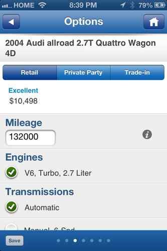 04 Audi Allroad Quattro all-wheel drive. 2.7Liter bi-turbo V6 250hp. 132k miles,