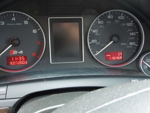 2004 Audi S4 quattro AWD with V8 4.2 Liter Engine, and a 6 Speed Manual Transmission. Only 116, 468 miles!! This beautiful luxury sedan has Power Windows, Power Locks, Power Mirrors, Dual Power & Heated Leather Seats, Cruise Control, Telescoping Wheel, AM/FM, Multi Disc CD Player, Moon Roof, Dual Exhaust, and Woodgrain Accents. This S4 runs a little rough until 2k RPM and then it smooths out. We are almost positive it needs timing chains and guides to make this car 100%. If you put a little cash into it, this will be an amazing car under book value for the lucky buyer! Take a look on eBay, these babies are selling upwards of $30,000. Don't miss the chance to own this beauty!!