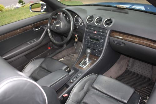 It is rare anywhere in the country to see the Audi S4 Convertible featuring Audi's Sprint Blue Pearl exterior to accompany a Black top and Black leather interior with Silver piping. This 2005 model is presented for sale by its 2nd owner after five years of roof-down summer driving on the beautiful roads of Virginia. While the all-wheel drive Quattro offers a chance to take the S4 out in less than ideal weather condition, this vehicle was garage stored and limited to ideal weather conditions, averaging about 8,400 miles per year for me and under 8,000 miles per year for its lifetime.