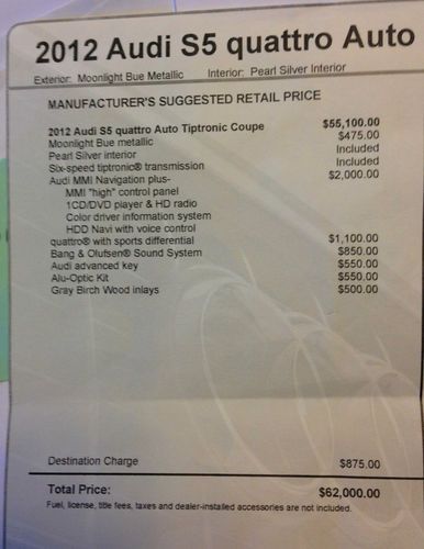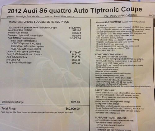 Options: Audi MMI Navigation Plus, Quattro with Sports Differential, Bang and Olufsen Sound System, Audi Advanced Keyless Ignition, Gray Birch Wood Inlays, Six-Speed Tiptronic Transmission, 19" 5-parallel spoke star wheels, S Sports Seats, Tire Pressure Monitoring system, Quattro All Wheel Drive, Alu-Optic Kit, Sunroof, Leather Seats, CD Player