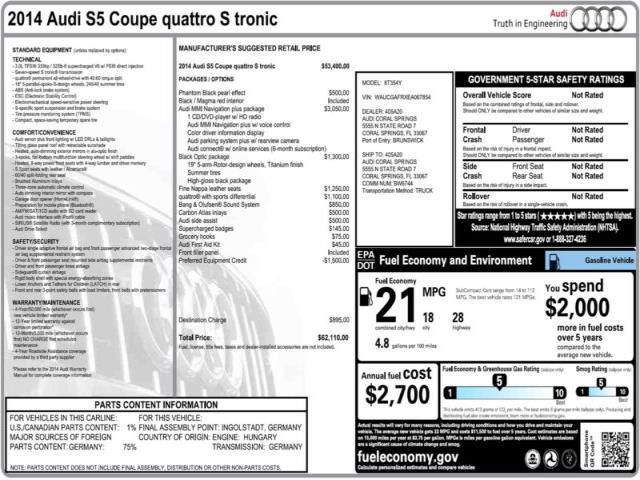 Fully loaded, 2014 Phantom Black Audi S5 Coupe Quattro S Tronic with Black Optic Package. The vehicle is 100% garage kept, 100% hand washed, and is in excellent condition. It has just 12,300 miles and I am the sole owner since it was purchased June 2014. The vehicle has over $8,000 in extra options. The interior of the vehicle is absolutely perfect. There is not one scratch on either of the black/magma red Fine Nappa leather seats and the carbon fiber interior inputs are flawless. The phantom black pearl exterior panting is in great condition, and the custom Black Optic package (19 5-arm-rotor titanium wheels and high-gloss black grill) really extenuates the car. I get complements almost daily from fellow Audi enthusiasts given the rare look of the car. I have only seen one replica of my vehicle since it was purchased. The mechanics of the car are in perfect condition. The quattro sports differential package brings out the best of the 333HP V6 FSI direct injection engine. The sole reason why I am selling the vehicle is because I am moving. Please feel free to contact me if you have any questions