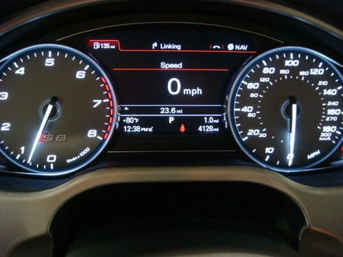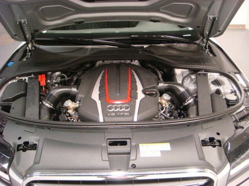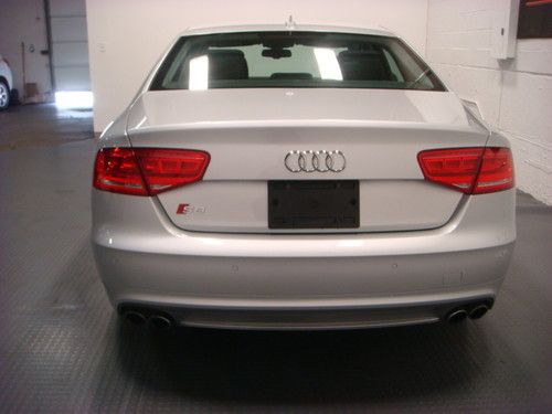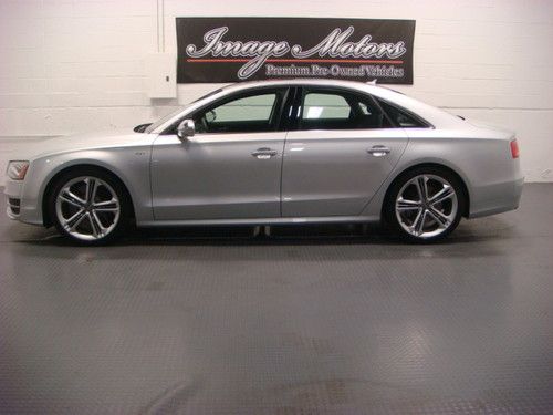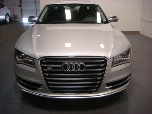 This absolutely fabulous S8 with 520HP was just traded to us by the original owner with only 4,128 miles after spending every night in a climate controlled garage. The previous owner is the ultimate car enthusist and has all of his cars washed and detailed weekly. Obviously there was not much dirt to wash off the S8 with such low mileage. Naturally the car has a Certified Clean Carfax with no accident history. This car looks and drives just like the day he picked it up from the dealership on October 12, 2012. The Ice Silver Metallic paint is in perfect condition with not a ding, dent, or scratch any where. The Black Leather interior is new from the Alcantara headliner down to the floor mats and everything in between. It even still smells new as no one has ever smoked in this car. The 21" tires are just like new with 4,000 miles and mounted on perfect factory alloy wheels. The S8 is covered under the factory warranty until October 2016 or 50,000 miles, whichever comes first. Have 2 Audi Advance Keys and all owners manuals. Would be happy to arrange to have the S8 delivered to your front door or pick you up at the Kansas City airport so you can drive this unbelievable car home as you let the navigation guide you, you listen to your HD Satellite radio, and talking on your bluetooth phone. It just doesn't get any better than that! Car may be purchased anytime prior to the ending of the listing by contacting RON 913-707-8111.