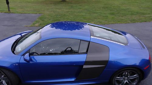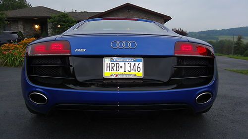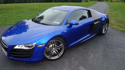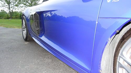 This auction is for a near showroom condition 2011 Audi R8 5.2. This Audi has practically no signs of wear. There has never been any paint work done on it and I am the original owner. The color is Sepang Blue pear effect with carbon fiber sigma sideblades. Also includes Alcantara headliner, leather package interior which includes leather dash panel and 19" Titanium Finish Alloy wheels. Beautiful black interior also shows no wear. Six speed transmission with ADDED BONUS of a RPW chip I had installed along with a GMG exhaust system.
