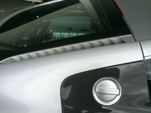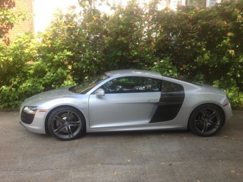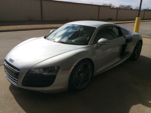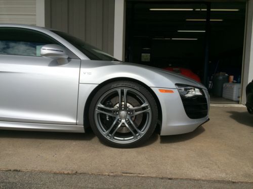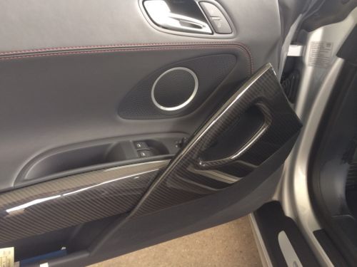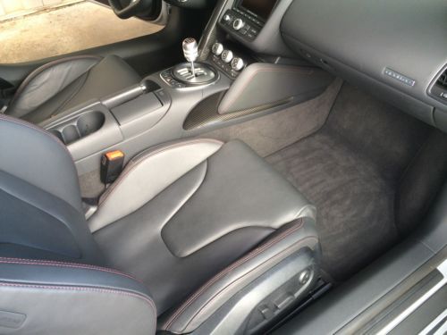 2012 Audi R8 coupe, V-10 w manual 6 speed transmission, silver with enhanced full black leather package w red stitching, carbon fiber Sigma interior inlays, carbon fiber side blades, illuminated door sills, instrument cluster in white, titanium finished 19" wheels, perforated sport leather steering wheel, navigation, 4,700 miles w no track time, original tires in excellent shape, flawless car in 'as-new' condition