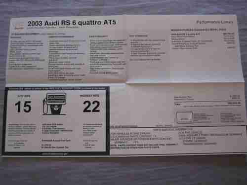 2003 Audi RS6, 4.2 Liter, 450 hp, DOHC V8biturbo, 5 speed automatic transmission w/ pad shifts and Quattro all-wheel drive.