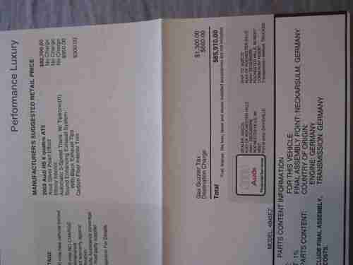 The vehicle will come with all maintenance records since new, all Audi books in its original leather casing, Original factory sticker, carfax report, original financing documentation and both keys.