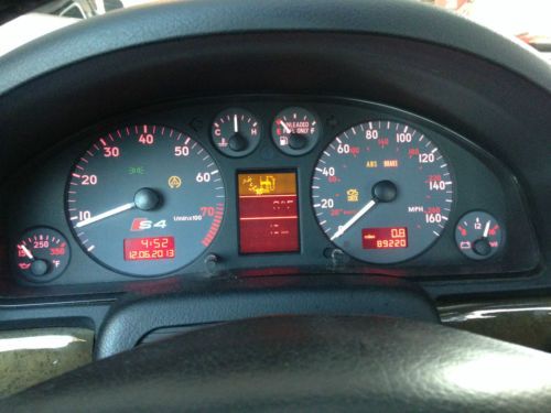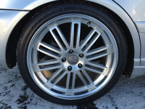 also includes 2 spare tires in the trunk that have good rubber as well -H&R Lowering Springs ($285) -AEM Boost Gauge ($175) -100% Authentic, OEM RS4 front bumper ($1500) -Wired for subwoofers ($100) -Euro plate ($85) -Timing belt kit w/ water pump ($1800) -Rotors and pads ($315) PLEASE VIEW A WALK AROUND VIDEO VIA THIS LINK ON YOUTUBE: http://youtu.be/eh6vzDq3X_4 You can see a couple of pics I posted from July 2013 this summer on a car cruise. I sold the BBS’ a couple months ago and bought the OEM wheels off of a forum and then the new tires shortly after I sold the BBS’. The new wheels do rub on some bumps but they look so clean and flush that I decided to keep them on for the new owner. The new owner may want to do a different wheel setup as the ride is noisy but I have driven it fine for a few hundred miles. Also the S4 does need some TLC to be back to perfect condition. It will need a new clutch eventually as the current clutch does slip. Also, I had to replace the driver’s door skin and there is a little surface rust by the molding. This rust spot has nothing to do with the rest of the car but just how the door skin was repainted. Matches perfect just probably not sealed correctly. The engine light and abs light are on. The engine light is on due to the aftermarket downpipes. The exhaust tone on this beast is simply amazing. There are some scratches and minor dings from normal wear and tear mainly on the front bumper. Please look at the pictures as I took pics of the TLC areas. Even though this S4 needs a little loving, it is such a solid ride. There aren’t many out there with less than 100,000 miles that actually had the Audi recommended maintenance done including the timing belt. Don’t miss out on this chance to own a clean Audi with only top of the line aftermarket parts as I am going to loss my A$$, but that was expected. My loss is your gain! Please call me at 701-214-2025 with any questions or shoot me an email. I will also accept offers to end the auction early so just let me know. Also please check my 100% positive feedback as I pride myself on my good reputation on eBay! Thanks for looking and happy bidding! |