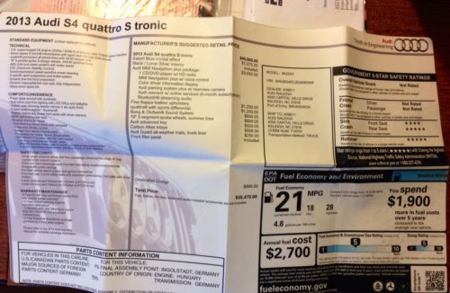 2013 S4 with Performance Upgrades (460+ hp)! Over $8,000 in performance upgrades: - GIAC/AWE Stage 2 Tune with Performance Pulley Kit - GIAC/AWE S-Tronic Performance Transmission Tune - AWE Tuning Audi Exhaust & resonated downpipes (102mm) Diamond Black quad tips - AWE Tuning Vent Mounted Boost Gauge Kit - Roc-Euro Intake - Eurocode Tuning Uberlegenes Stabilisatoren System (USS) adjustable swaybar set - Eurocode billet aluminum adjustable front end links - Eurocode billet aluminum rear end links - Eurocode Alu Kreuz billet aluminum drivetrain stabilizer - H&R OE Sport Springs More extras: - XPEL Ultimate clear bra (entire front end, headlights, and full hood) - Ceramic window tint. Uninstalled extras: