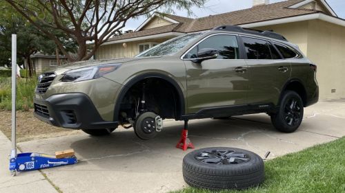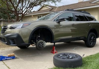 The Outback rides on 18-by-7-inch aluminum alloy wheels with a 55 mm offset and 225/60R18 Yokohama Avid GT BluEarth tires. The assemblies weigh 53 pounds apiece, which is about par for the course. In off-road-speak, that size works out to just under 29 inches tall, which is pretty healthy. There are those that put bigger all-terrain tires on Outbacks, but one must be very mindful of not going overboard whenever strut suspension is present. The limiting factor, which you canÂ’t do much about, is the clearance between the top of the front tire and the strutÂ’s lower spring perch.