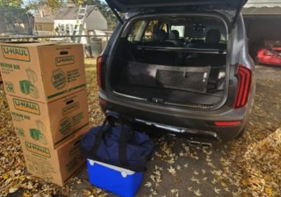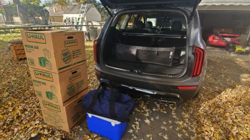 IÂ did have that carry-on and cooler and they fit back there just fine, whether side-by-side or stacked. Now, once we drop the third-row seats, things start to look up. Remember, Kia says the Telluride has 46 cubic feet of cargo space behind the second row, which should theoretically accommodate 15 U-Haul boxes with room to spare. Let's see how well that translates to the real world.