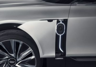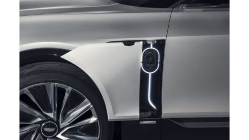 This carÂ’s most intriguing element so far is the charge outlet panel integrated into the front fender. The large piece appears to lift up and slide out of the way when itÂ’s time to plug in. This reveals a decorative LED light strip that outlines the outlet, ultimately leading into the Cadillac logo above. Below the panel is a small, silver GM badge that if our guess is correct, says “Ultium” for the Ultium battery technology going into the Lyriq.Â