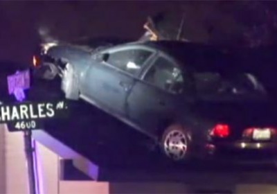 Fri, 06 Jan 2012 Residents of a Fresno, California apartment building recently awoke to debris falling from their ceiling after a car thief managed to execute a perfect parking job on the structure's roof. Police say 26-year-old Benjamin Tucker stole the Saturn sedan from a nearby house before striking either a curb or some rocks, vaulting the vehicle into the air and onto the roof. After seeing his predicament, Tucker leapt from the roof and fled the scene. Or at least he tried to. Tucker broke his leg in the fall and only made it around a quarter of a mile from the crash when police picked him up.No one else was harmed in the stunt.
