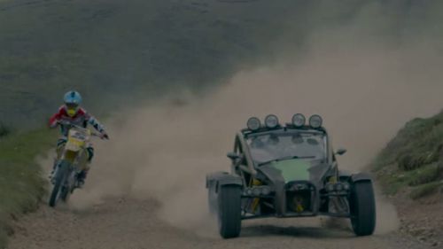 Thu, Oct 1 2015 Ariel introduced the Nomad at the beginning of the year, which is basically an Atom converted to sand-rail duty with the addition of features like a composite cage and waterproof cockpit, Hella light bar, and Ohlins suspension with hydraulic bump stops. Evo reviewed it not long after, now Drive has got hold of it and put Steve Sutcliffe at the wheel, sending him to the Sweet Lamb Rally Center in Wales. The Nomad in this guise also gets a winch and BF Goodrich tires with a rear high-mounted spare. The motor is a US-spec, 2.4-liter Honda unit tuned to 240 horsepower and 235 pound-feet of torque, all going to the rear wheels only. The weight is just 1,477 pounds.For kicks, they sent Northern Irish motocrosser Graeme Irwin along to give Sutcliffe a point of reference. We're used to seeing cars battle bikes, and unless it's wet or the race goes to beyond 200 miles per hour the bike almost always takes it. Irwin was on his Suzuki RMZ-450, a bike with about 60 hp, but that, combined with Irwin's skills, was plenty enough to keep Sutcliffe hard at work. You can watch the dust fly in the video above.