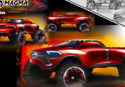The Ram Magma's name is suggested by the translucent polycarbonate windows that forego traditional tinting for a crystalline red privacy sheen "inspired by volcanic igneous rock." The Magma also showcases multiple light bars stretched across the roof, a UV water purifier system between the cab and bed, and a stove embedded into the tailgate. Thankfully, the feature set includes an adjustable suspension that lowers the cab to mortal levels of ingress.