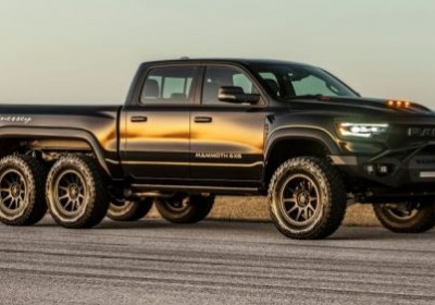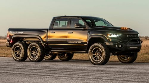 Thu, Apr 21 2022A few things have changed on the way to the Hennessey Mammoth 1000 6x6 TRX, the six-wheeled pickup based on the 2021 Ram 1500 TRX announced in September 2020. Back then, it was going to be powered by the 7.0-liter Hellephant engine, tuned from a stock 1,000 horsepower to 1,200 hp, it would cost $500,000 before customization, and the Texas tuner said there'd only be three built — likely owing to the exceeding scarcity of that crate motor. The good news for folks who thought they'd be left in the cold is that a slightly different but still astonishingly massive Mammoth is going into serial production, and at a lower price. Instead of the Hellephant, a 6.2-liter Hellcat lives under the chest-height hood. In the Ram 1500 TRX the engine makes 702 hp and 650 lb-ft., but a 2.65-liter supercharger is the heart of a Lone Star State overhaul boosting output to 1,012 hp and 969 lb-ft.