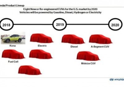 Wed, Nov 15 2017 Hyundai announced a very aggressive crossover strategy for the next couple of years, with a total of eight vehicles launched between now and 2020. One of those is the already revealed sub-compact Hyundai Kona. The other seven crossovers range in size and fuel types, and Miles Johnson at Hyundai confirmed to us that all of them will be coming to the U.S.The first to launch is the aforementioned Kona, coming in early 2018. Also coming early that year is an unnamed hydrogen fuel cell vehicle. This hydrogen crossover will likely be sized and styled similarly to the FE Fuel Cell Concept shown at this year's Geneva show. A previous report about the production version stated that it would have a range of about 360 miles. Later that year will be two unnamed crossovers without any indication of size. They will also be joined by an electric crossover.