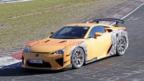 Wed, Oct 10 2018 The Lexus LFA was a real engineering tour de force. Sure, it was stuck in development hell for years, and the 4.8-liter V10's 552-horsepower output wasn't super impressive when it came out, but it integrated a ton of expertise Toyota gained from its F1 team in the early to mid 2000s. Unfortunately, it didn't sell well. Last year, we found there were a few new models sitting on dealer lots, five years after the 500-model run ended. Still, it looks like Toyota may not have given up on the idea of a race-derived flagship for Lexus, at least based on this prototype running around the Nurburgring this week.At first glance, the car pictured here looks like an LFA with the Nurburgring Package and some camouflage on the front and rear fenders. If you look closely, you can see that the fenders are significantly wider than on the standard LFA. Based on the license plate, this appears to be the same car with two different sets of wheels. Lexus may simply be swapping out worn tires, or they may be testing different wheel and tire combinations to fit the wider wheel wells.