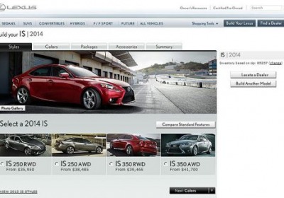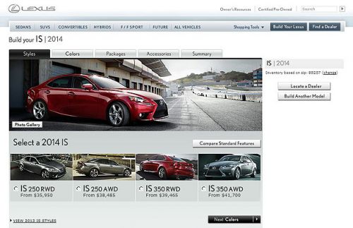 Mon, 08 Jul 2013Throw away those scraps of paper and pull yourself up to a keyboard, as Lexus has launched the online configurator for its all-new 2014 IS sedan. The base price for the entry-level IS 250 RWD is $36,845 (all listed prices include the $895 delivery fee), delivering a 2.5-liter V6 rated at 204 horsepower that provides enough thrust for a 0-60 sprint in 7.7 seconds. The range-topping IS 350 AWD starts at $42,595, packed with a 3.5-liter V6 rated at 306 horsepower that will deliver 60 mph in just 5.7 seconds.