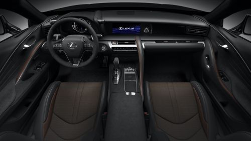The finish is called Graphite Black, and like all paint codes for the LC, it's ostensibly unique to the car. Don't bother looking for subtle contrasts or two-tone treatments. Everything from the spindle grille, door mirror casings, headlight and rear light cluster surrounds to the housings for the headlight washers has been done in Graphite Black.