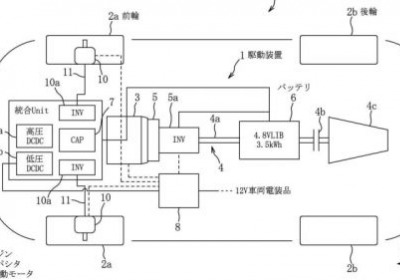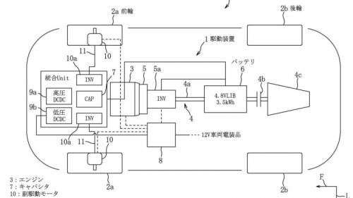 The AWD system acts on-demand. Given the signal, the capacitors discharge their energy to the wheel motors, and recover energy from braking. When the capacitors are at full charge, they send excess regen energy to the lithium-ion battery; conversely, the battery can recharge the capacitors when they're low and the front hub motors need power. The patent explains that the ICE works with the rear e-motor to drive the rear wheels at low speeds, the front motors called on to "generate an output only when a large output is required in the high vehicle speed range."