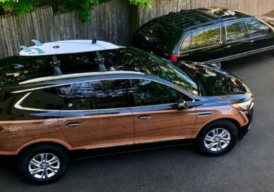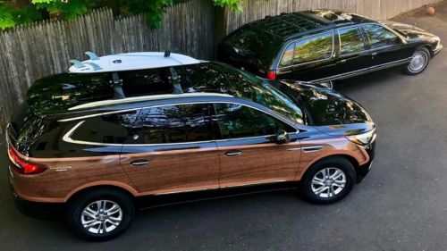 According to GM Authority, who spotted House's Enclave, the look was achieved with a vinyl wrap. After exploring the idea of a first-gen Enclave woody or a Regal TourX woody, House decided the application worked best on a current Enclave. The mock-ups were done on the computer, and Scranton Cadillac Buick GMC completed the work. The wrap starts just beneath the headlights and wraps around the entire vehicle. Furthering the theme, House took a photo of the woody with a surfboard.