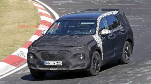 Tue, Jun 20 2017 Last week we showed you Hyundai's newest and smallest crossover, the Kona. This week, we bring you the newest version of Hyundai's largest crossover, the Santa Fe, albeit beneath much camouflage. There's a bigger connection between these two vehicles than just timing and size contrast, though. They appear to share some styling cues.We can see through the vinyl draperies on the nose and tell that it has an aggressive version of the Hyundai cascading grille, much like the Kona. It also has the slender top headlight element combined with larger, separate elements lower in the fascia, again like the little crossover. The camouflage also fits closely enough to the body to reveal that the main grille will be flanked by large vents that encompass the lower headlamps. We also see some Recaro racing seats through the windshield, but we doubt those will make production. Prove us wrong, Hyundai!