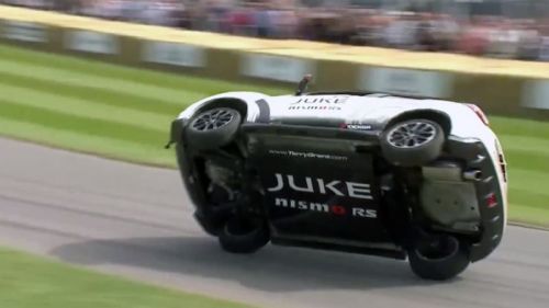 Sat, Jun 27 2015 Motorcycle enthusiasts live by the epithet "two wheels good, four wheels bad." But what about when the two good wheels happen to be on a four-wheeled vehicle? And what, we might add, happens when said four-wheeled vehicle is trying to breaka a Guiness World Record? Well, you get the latest stunt from the Goodwood Festival of Speed.In between the vintage, occasionally crashy racers and modern metal, the British division of Nissan sent stunt driver Terry Grant out onto the famous Goodwood circuit in a Juke Nismo RS, where he ran the entire course while driving on two wheels. Really, you need to see it to believe it.