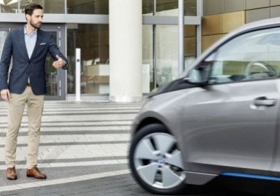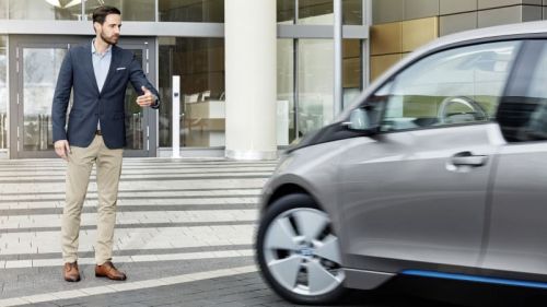 Actually, you don't even need to wave to get this i3 Concept to start moving. From inside your house, simply picking up the key can signal your connected garage door to open and tell your car to pull out into the driveway. Out in the wider world this concept takes automated parking a step further than current in-car parking assistance systems. Once a spot is found, the driver gets out and waves at the car. The i3 then does all the movement on its own.