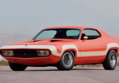 While it doesn't sport as lurid a paint scheme, the older 1970 Plymouth Road Runner is still bold, and has more body styling changes than the Duster. Up front it features a custom grille and rectangular headlights. Along the side, the door handles have been removed, and fat four-inch fender flares fitted. The tail has a molded-in rear wing and unique one-piece taillight lens. The car's paint is a triple-tone of black, white and an orange gold that reflect the colors in the cartoon Road Runner's dust trail. The character is featured prominently on the doors with its trail extending into the side scoops. The paint scheme is reflected inside with custom floor mats. Under the hood is a stock 425-horsepower 426-cubic inch Hemi V8 backed by an automatic transmission.