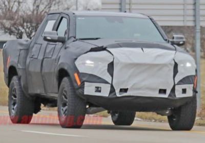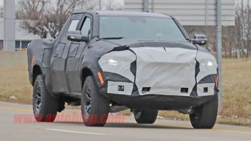 What stands out on this prototype are the bulging fenders front and rear. Instead of simple wheel housing extensions, these are full-on box flares like the ones worn by the Raptor. The hood appears to be equally bulging, good for highlighting the supercharged V8 underneath. The front bumper is similar to that of the Ram 1500 Rebel's with more raised sections in front of the tires to provide more clearance.