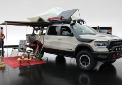 Many ready-to-purchase accessories have been added to the Ram 1500 OTG, too. From the Mopar catalog comes off-road lights, rock rails, wheels and bolt-on fender flares. The utility rack, basket and tent all came from Yakima. A roof-mounted solar array along with sliding cooking areas and bed-mounted cooler all come from Dometic. A representative from Dodge also showed how the split tailgate can be used as an easily accesible place to have fold out cooking or table space.
