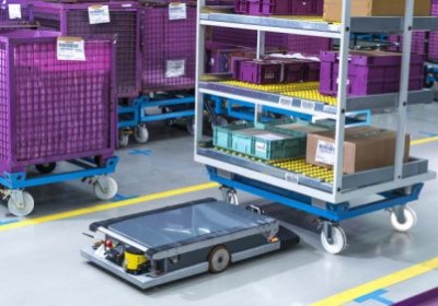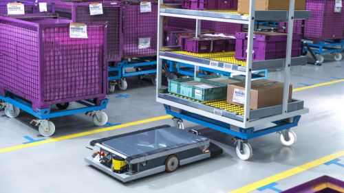 Munich/Wackersdorf. Plant Wackersdorf supplies the BMW Group's international assembly and production sites with car parts. In the hall of Supply Logistics, a self-driving robot maneuvers itself underneath a roller container with parts. Silently and with flashing lights, it picks up the container and begins to move through the logistics hall. The system is complicated and extensive; nobody can find their way around without a good sense of direction. But this is no problem for the transport robot, which is about the size of a suitcase. Flanked by radio transmitters and equipped with a digital map, it drives independently to the destination of the goods. When tugger train cross its path, a fitted sensor identifies the obstacle and stops the self-driving robot with car parts loaded weighing up to half a ton.