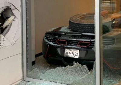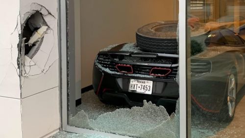 The car was getting serviced at McLaren Houston, which is right next to Interstate 45, also known as North Freeway, in Texas. According to KHOU, the tire broke free of an 18-wheeler that had just crashed and found its way through the dealership glass. Luckily, nobody was injured.