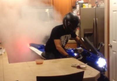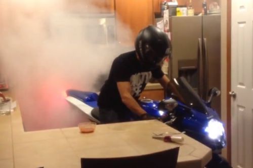 For reasons that aren't readily obvious in the 29-second video, this is a man doing a burnout on a Suzuki GSX-R in a kitchen. We've no idea what prompted either the burnout or the setting, but it is one of the stranger videos we've seen lately.